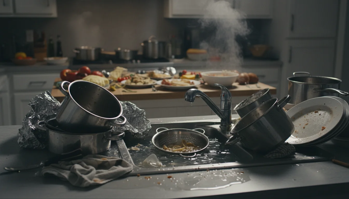 Kitchen sink with slow drain and pooled water during Thanksgiving prep